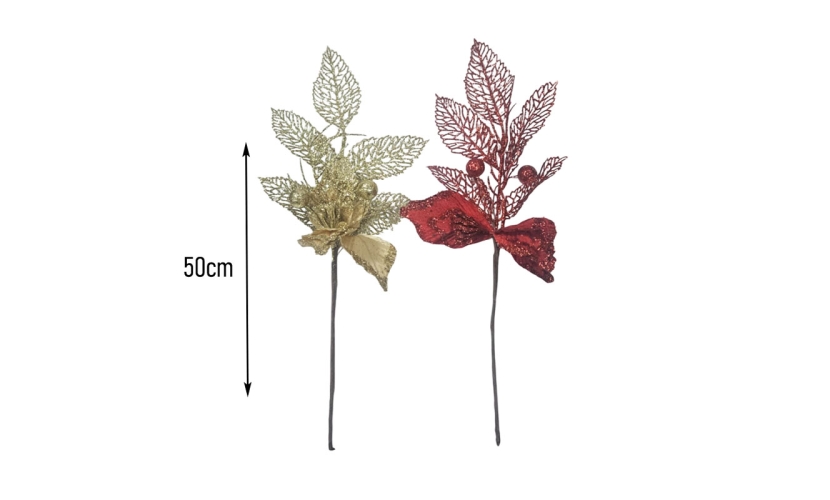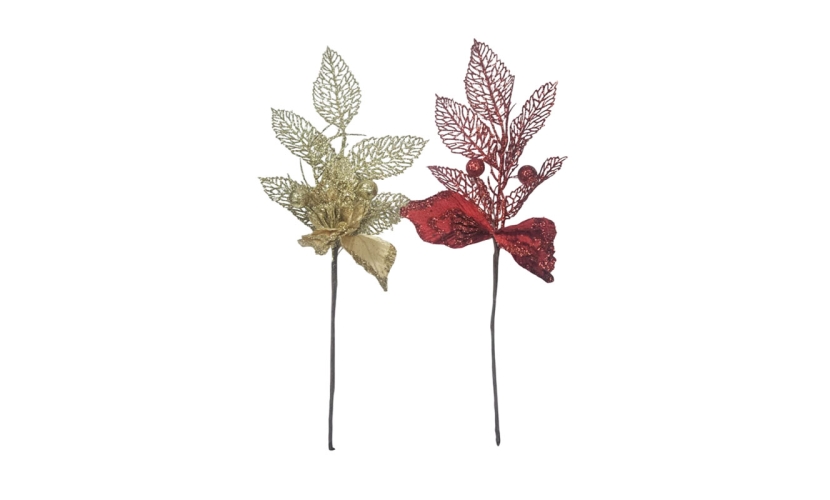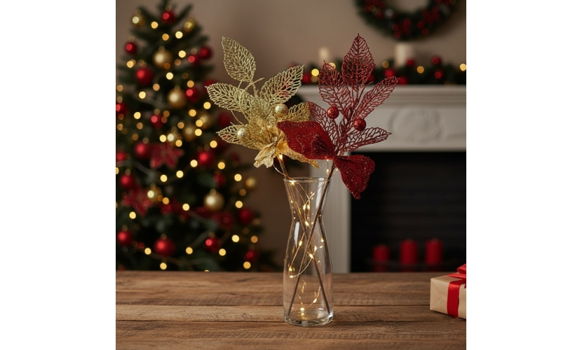 Διαθέσιμα σε δύο κλασικές αποχρώσεις, χρυσό και κόκκινο, διαθέτουν φύλλα με λεπτομερή σχέδια και έντονη λάμψη γκλίτερ που αντανακλά το φως, δημιουργώντας μια ατμόσφαιρα πολυτέλειας. Κάθε κλαδί περιλαμβάνει επίσης διακοσμητικά στοιχεία όπως μούρα ή φιόγκους, προσθέτοντας μια επιπλέον πινελιά κομψότητας.