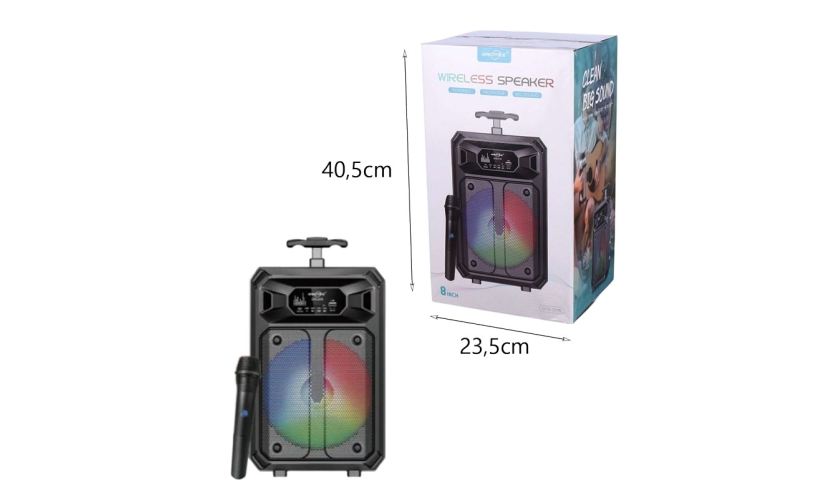 -Χαρακτηριστικά προϊόντος:• Διάμετρος ηχείου: 8 ίντσες• Συνδεσιμότητα: Bluetooth, USB, TF card, Aux• Συνοδεύεται από ασύρματο μικρόφωνο• Ενσωματωμένος LED φωτισμός RGB• Ρυθμιζόμενη ένταση μικροφώνου & echo effect• Ενσωματωμένη μπαταρία – φορητή χρήση χωρίς ρεύμα• Συρόμενη λαβή + ροδάκια για εύκολη μετακίνηση• Ισχύς εξόδου: Ικανοποιητική για μικρούς και μεσαίους χώρους• Διαστάσεις συσκευασίας: 40,5 x 23,5 cm