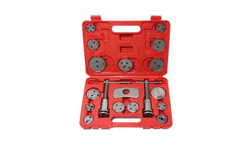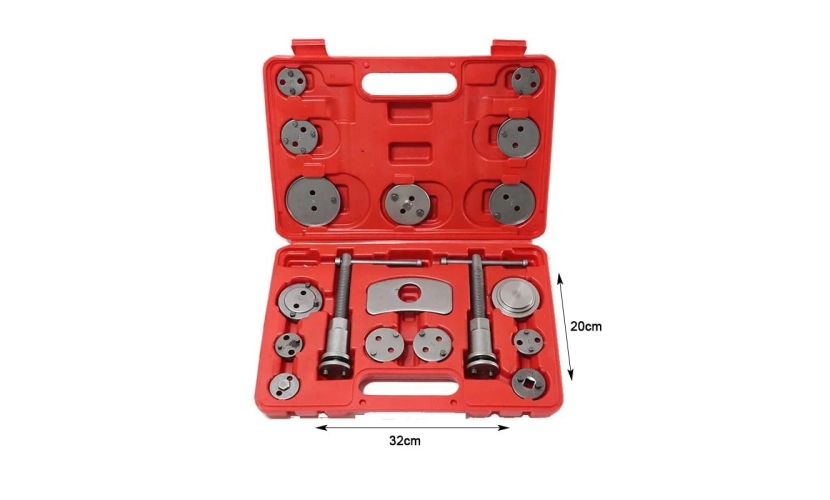 Πρόκειται για σετ επαναφοράς εμβόλων φρένων, συμβατό με τις πιο δημοφιλείς μάρκες Απαραίτητο εργαλείο αν θέλετε να αντικαταστήσετε τα τακάκια των φρένων Χρησιμοποιώντας τα σύνεργα του σετ, αποφεύγετε τις φθορές στις φλάντζες Η ανθεκτική, πλαστική εργαλειοθήκη περιέχει 2 άξονες, 2 πλάκες πίεσης, 17 δίσκους επαναφοράς του προσαρμογέα