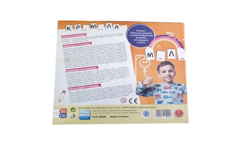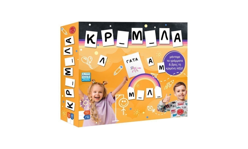 Αποκαλύψτε τη λέξη που έχει κρύψει ο συμπαίκτης σας, γράμμα γράμμα, προσέχοντας όμως μην οδηγηθείτε στην κρεμάλα… Διαφορετικά, ο συμπαίκτης σας κερδίζει τους βαθμούς… Παίχτες 2-6 Ηλικία 8+