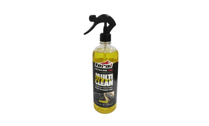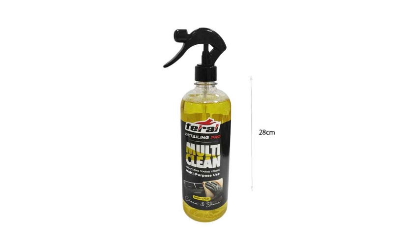 Το Feral Multi Clean είναι ένα πανίσχυρο καθαριστικό γενικής χρήσης με αντιστατικούς παράγοντες, σχεδιασμένο για να απομακρύνει ακόμη και τους πιο δύσκολους λεκέδες. Κατάλληλο για χρήση στο αυτοκίνητο αλλά και στο σπίτι, προσφέρει άψογη καθαριότητα και φρεσκάδα.Έτοιμο προς χρήση: απλά ψεκάστε ομοιόμορφα στην επιφάνεια και σκουπίστε με στεγνό πανί ή χαρτί.Με δροσερό άρωμα εσπεριδοειδών, αφήνει τις επιφάνειες καθαρές και λαμπερές.
