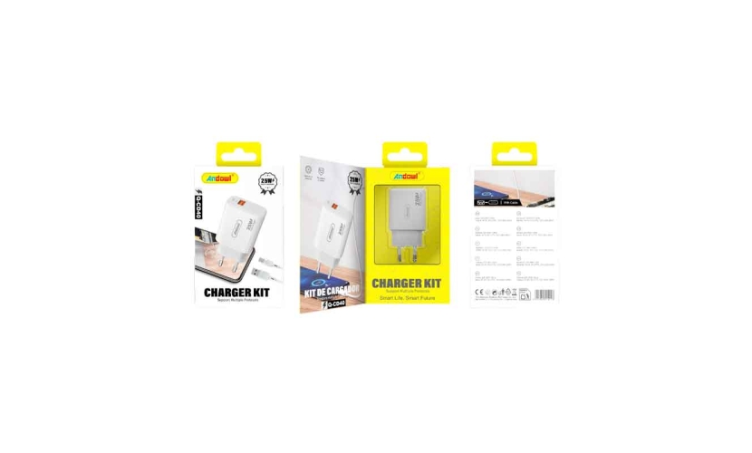 Γρήγορος φορτιστής Andowl με τεχνολογία QC 3.0 και ισχύ 25W, ιδανικός για smartphones, tablets και άλλες συσκευές. Διαθέτει είσοδο 220-240V και έξοδο 5V-3A, 9V-2.77A, 12V-2.08A, προσφέροντας ταχύτατη και ασφαλή φόρτιση. Περιλαμβάνει καλώδιο USB-C για άμεση χρήση.