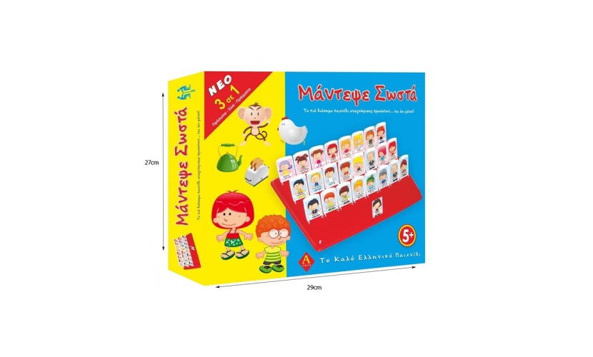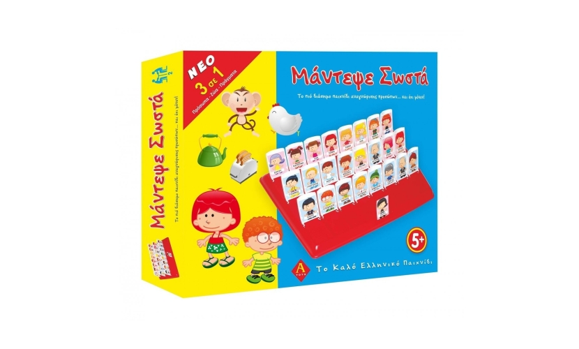 Περιγραφή Το πιο διάσημο παιχνίδι αναγνώρισης προσώπων και όχι μόνο. Για 2 παίκτες από ηλικία 6 ετών και πάνω. Σκοπός του παιχνιδιού: Να αναγνωρίσεις ποιός από τα πρόσωπα που βλέπεις μπροστά στην κονσόλα σου έχει επιλέξει ο αντίπαλος παίχτης. Περιεχόμενα: 2 κονσόλες, 48 κάρτες για τις κονσόλες, 48 κάρτες "επιλογής"