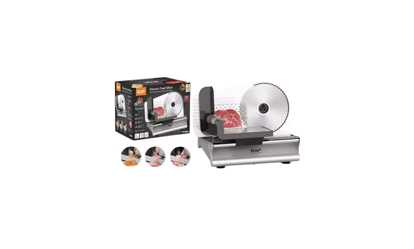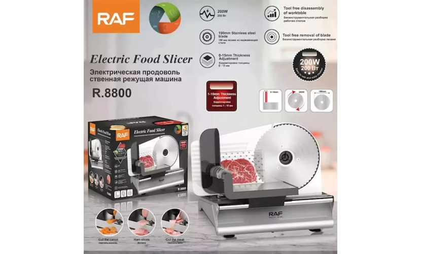 Ο Κόφτης Αλλαντικών Ηλεκτρικός 200W Inox RAF R8800 είναι μια συμπαγής συσκευή για την οικιακή κουζίνα, ιδανική για τον τεμαχισμό κρέατος, λουκάνικων, ημίσκληρων τυριών, σκληρών λαχανικών και φρούτων. Το πάχος κοπής ρυθμίζεται από 0 έως 15 mm μέσω του κουμπιού ελέγχου. Η συσκευή διασφαλίζει ότι οι φέτες έχουν το ίδιο πάχος, κάτι που είναι δύσκολο να επιτευχθεί με το χέρι. Είναι εξοπλισμένος με: