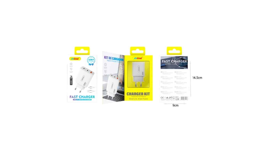 Γρήγορος φορτιστής Andowl με ισχύ έως 65W, ιδανικός για smartphones, tablets, laptops και άλλες συσκευές. Διαθέτει διπλή έξοδο USB-C και θύρα USB-A, υποστηρίζοντας πολλαπλά πρωτόκολλα γρήγορης φόρτισης (QC 3.0, PD κ.ά.). Εξασφαλίζει ταχύτητα, ασφάλεια και συμβατότητα με πληθώρα συσκευών.