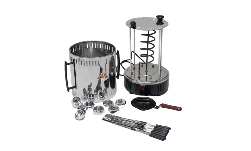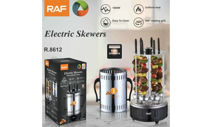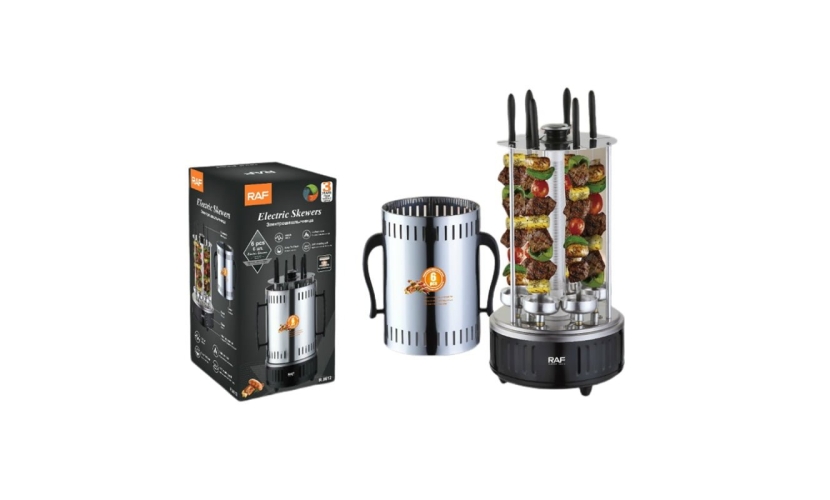 6 θέσεις για σουβλάκια Θερμαντήρας χαλαζία Ισχύς 1000 W Διπλή λαβή από ανοξείδωτο χάλυβα Εύκολο στο καθάρισμα Γρήγορο και ασφαλές μαγείρεμα Αυτόματη περιστροφή Σουβλάκια συχνότητας περιστροφής - 0,2 φορές / δευτερόλεπτο.