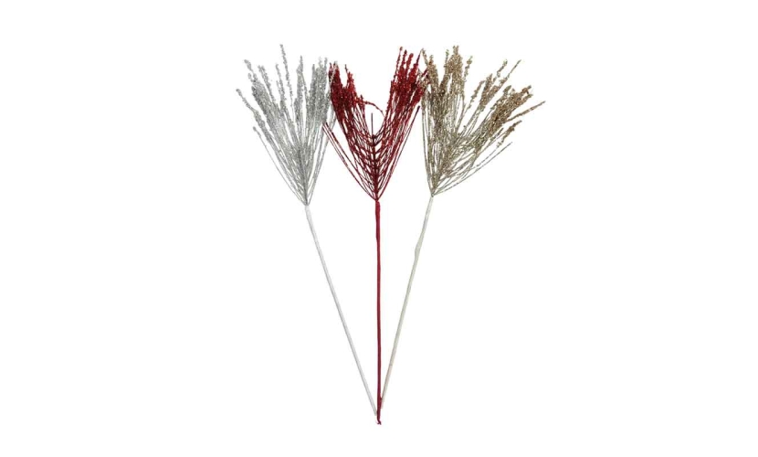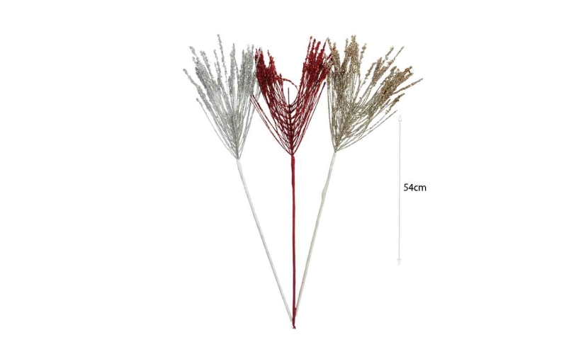 Διακοσμητικό χριστουγεννιάτικο κλαδί με αστεροειδές σχέδιο και γκλίτερ, ύψους 46cm. Ιδανικό για στολισμό δέντρου, γιορτινές συνθέσεις ή βάζα. Διατίθεται σε κόκκινο, ασημί και χρυσό χρώμα. Προσοχή: Το προϊόν διατίθεται σε διάφορα χρώματα και σχέδια και η επιλογή γίνεται τυχαία, βάσει διαθεσιμότητας. Η τιμή αφορά ένα (1) τεμάχιο και όχι το σύνολο των προϊόντων που απεικονίζονται στη φωτογραφία.