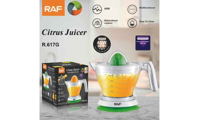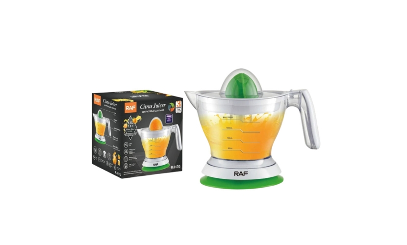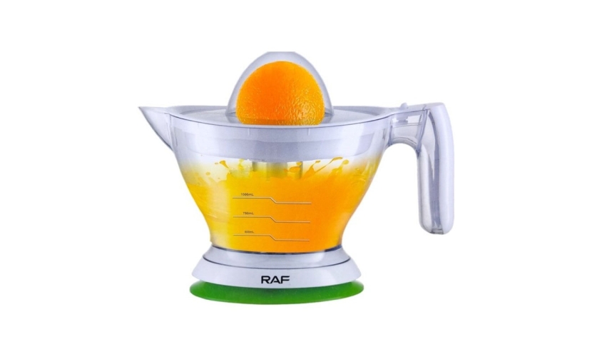 Ηλεκτρικός στίφτης, της εταιρείας Raf, με ισχύ 40 Watt. Διαθέτει έναν κώνο κανονικού μεγέθους κατάλληλο για πορτοκάλια, ώστε να απολαμβάνετε καθημερινά φρέσκους χυμούς, πλούσιους σε βιταμίνες. Το φίλτρο που συμπεριλαμβάνεται θα ξεχωρίσει τον χυμό από τον πολτό και τα κουκούτσια, δίνοντας σας το βέλτιστο αποτέλεσμα και την καλύτερη γεύση. Το μόνο που έχετε να κάνετε είναι να κόψετε τα φρούτα και μόλις ασκήσετε πίεση στον κώνο αυτόματα θα αρχίσει να τα στίβει. Το φρούτο θα αποχυμωθεί σε μεγαλύτερο ποσοστό, σε σχέση με έναν χειροκίνητο στίφτη και παράλληλα θα καταβάλετε πολύ λιγότερο κόπο. Είναι συνεχούς ροής που σημαίνει ότι έχει στόμιο εκροής και η εξαγωγή του χυμού μπορεί να γίνει απευθείας στο ποτήρι σας, παίρνοντας έτσι και την τελευταία σταγόνα του χυμού σας. Είναι κατασκευασμένος από ανοξείδωτο ατσάλι κάτι που τον κάνει πιο ανθεκτικό στις φθορές και στον χρόνο, ενώ παράλληλα καθαρίζεται εύκολα. Τέλος, όλα τα αποσπώμενα μέρη μπορούν εύκολα να καθαριστούν.