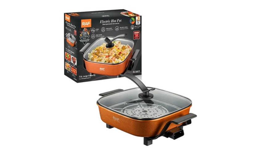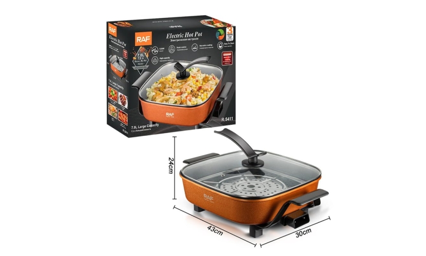 Το ζεστό δοχείο χωρητικότητας 7,0 λίτρων περιέχει μια σχάρα ατμού από ανοξείδωτο χάλυβα Πλάκες με αντικολλητική επίστρωση Θερμοστατικά ελεγχόμενο Έλεγχος μεταβλητής θερμοκρασίας Εύκολο στη χρήση και εύκολο καθαριστικό Κατανάλωση ισχύος 1350 W Τάση και συχνότητα: 220-240V,50/60Hz