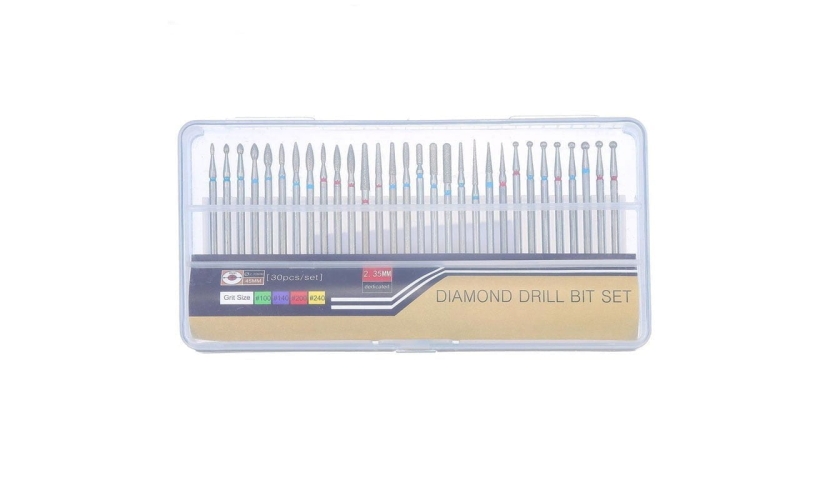 Διαμαντόφρεζες για τροχό νυχιών σετ 30τεμ σε κασετίνα - Diamond drill bit set Διαμαντόφρεζες για Τροχό Νυχιών Σετ 30 τεμαχίων σε κασετίνα. Κοπτικά τροχού για μανικιούρ. Μύτες για Τροχό Νυχιών, Σετ 30 τεμαχίων σε κασετίνα Ανταλλακτικά τροχού μεταλλικά για μανικιούρ. Περιέχει 30 τεμάχια Υψηλής ποιότητας. Σετ 30 τεμαχίων σε κασετίνα για τροχό νυχιών διάμετρος σφήνας 2,35 mm. Μπορεί να τοποθετηθεί στους περισσότερους τροχούς. Κατασκευασμένα από ανοξείδωτο χάλυβα για να μη σκουριάζουν.