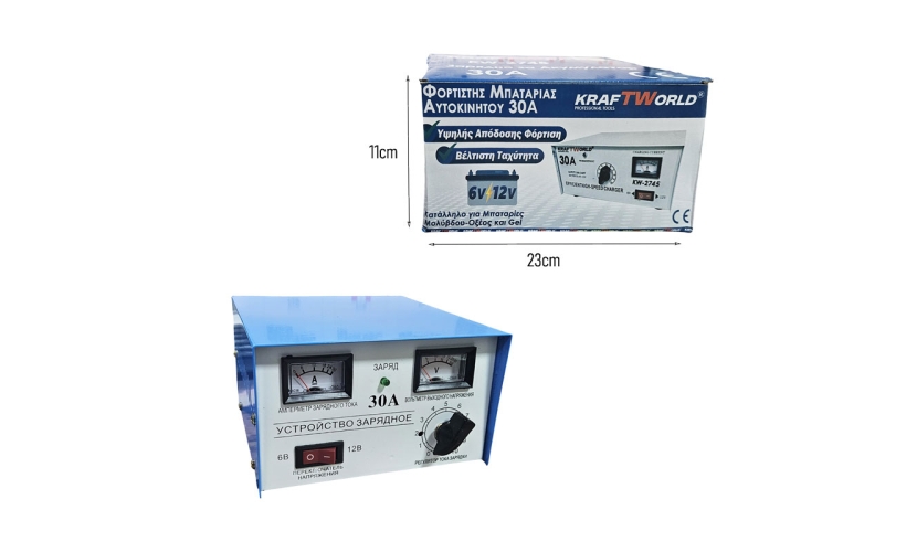 Ο φορτιστής μπαταρίας αυτοκινήτου 30A είναι κατάλληλος για τη φόρτιση και συντήρηση μπαταριών μολύβδου-οξέος και GEL. Διαθέτει ένδειξη αμπερόμετρου και βολτόμετρου για ακριβή έλεγχο της φόρτισης, καθώς και ρυθμιζόμενο διακόπτη έντασης ρεύματος.
