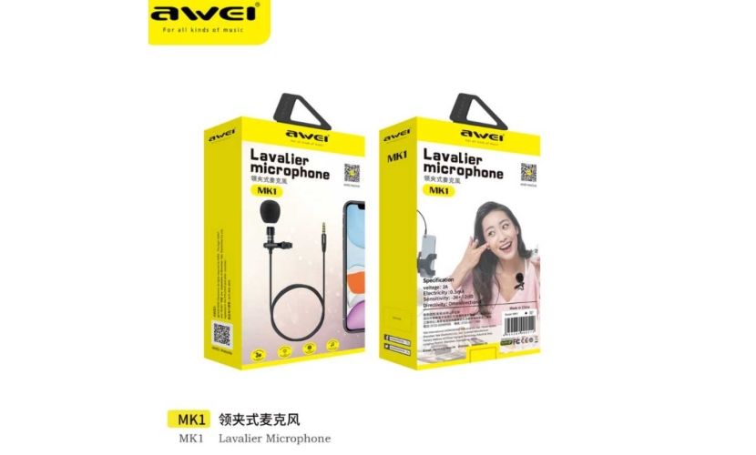 Το Awei MK1 είναι ένα ελαφρύ μικρόφωνο με κλιπ που μπορεί να τοποθετηθεί εύκολα πάνω στα ρούχα. Το βάρος του είναι μόλις 20gr και το καλώδιο 3 μέτρων παρέχει ελευθερία κινήσεων. Είναι συμβατό με οποιοδήποτε συσκευή που διαθέτει είσοδο μικροφώνου 3,5 mm.