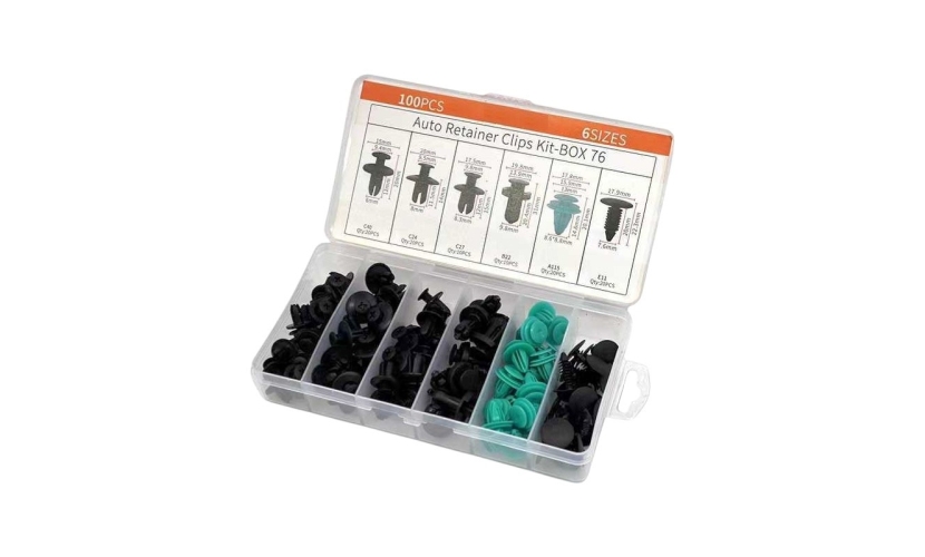 Σετ συνδετήρες αυτοκινήτου 6 τύπων σε πρακτική κασετίνα με διαχωριστικά. Περιλαμβάνονται 100 τεμάχια.