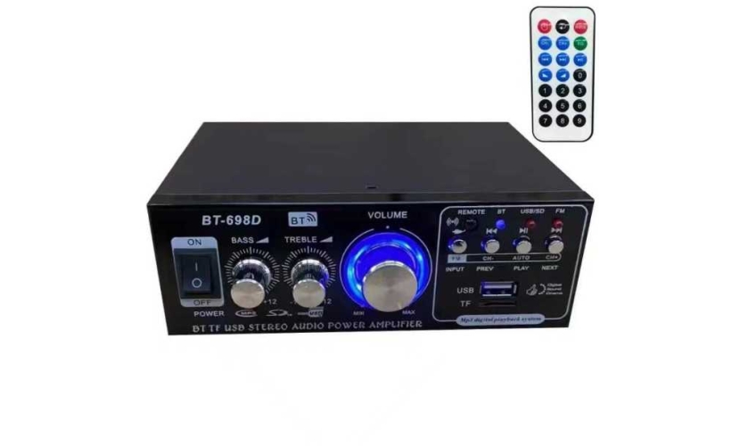 Στο μπροστινό panel διαθέτει ρυθμιστικό έντασης (φωτιζόμενο με Blue Led φωτισμό) και ρυθμιστικό Bass και Treble. Δεξιά του υπάρχει το panel διαχείρισης των MP3 τραγουδιών, όπως επίσης και οι υποδοχές του USB και της κάρτας SD. Από το πλήκτρο "INPUT" επιλέγεται τη λειτουργία AUX - FM - MP3 (USB/SD). BLUETOOTH Στη πίσω πλευρά υπάρχει ένα ζεύγος RCA για τη σύνδεση της εξωτερικής πηγής (AUX), όπως επίσης και οι κλέμες σύνδεσης των ηχείων. Διαθέτει τηλεσκοπική κεραία για τη λήψη των FM ραδιοφωνικών σταθμών. Ο ενισχυτής λειτουργεί απευθείας με τάση 220V AC ή με εξωτερική τροφοδοσία 12V DC / 5A. Αυτή η επιλογή σας δίνει τη δυνατότητα να τον λειτουργήσετε ακόμα και στην εξοχή με μια μπαταρία αυτοκινήτου! 1. Mini HIFI ψηφιακός ενισχυτής ήχου Bluetooth. 2. Κάρτα SD, δίσκος U, αναπαραγωγή MP3, υποστήριξη ασύρματης σύνδεσης Bluetooth. 3. Υποστηρίζει στερεοφωνικό ραδιόφωνο FM. 4. Με έλεγχο πρίμων, μπάσων και έντασης, πολύ εύκολο στη χρήση. 5. Η χαμηλή παραμόρφωση παρέχει καθαρότερο, δυνατότερο και ισχυρότερο ήχο. 6. Έξοδος δύο κύριων καναλιών. 7. Με τηλεχειριστήριο. 8. Ενεργοποίηση DC / AC.