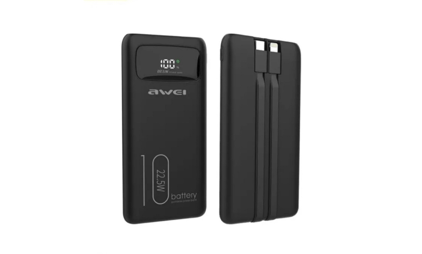 Powerbank Awei χωρητικότητας 10.000mah, με λειτουργία γρήγορης φόρτισης στα 22.5W και 2 ενσωματωμένα καλώδια TypeC και Lightning.