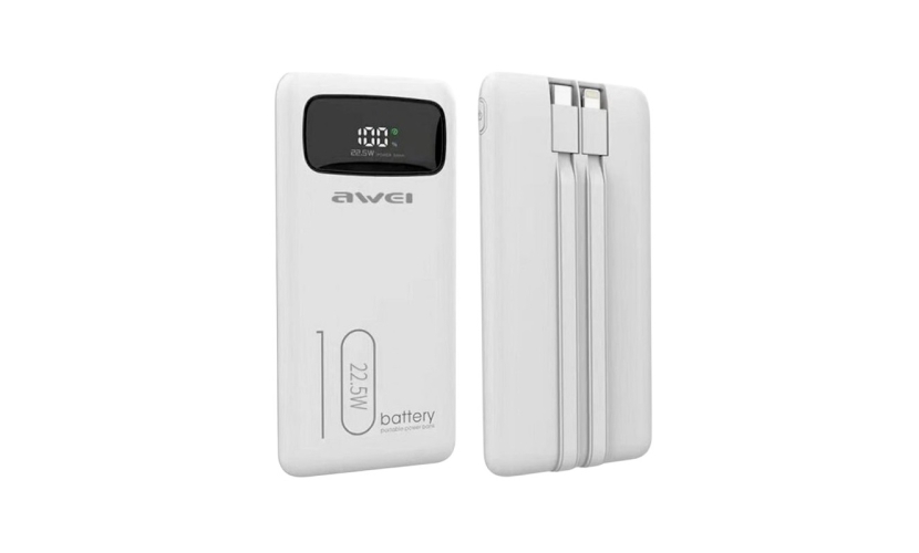 Powerbank Awei χωρητικότητας 10.000mah, με λειτουργία γρήγορης φόρτισης στα 22.5W και 2 ενσωματωμένα καλώδια TypeC και Lightning.
