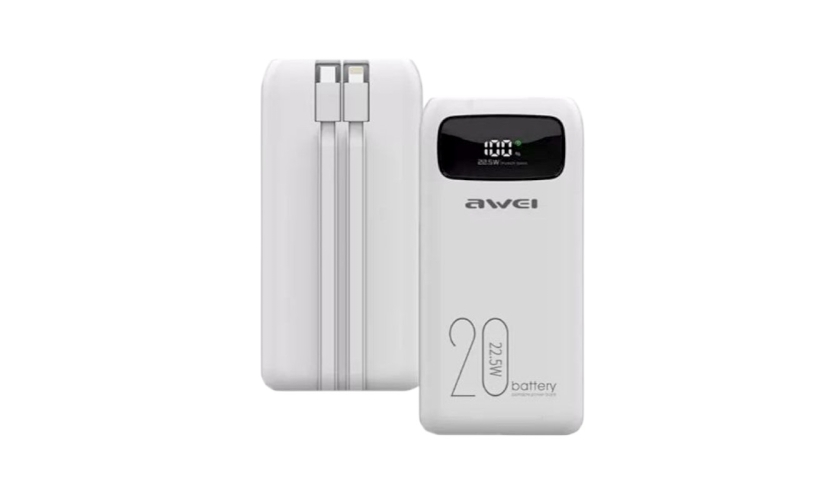 Powerbank Awei μεγάλης χωρητικότητας 20.000mah, με λειτουργία γρήγορης φόρτισης στα 22.5W και σε πρακτικό μέγεθος για εύκολη μεταφορά παντού. Διαθέτει ενσωματωμένα 2 καλώδια φόρτισης Type C & Lightning για να μην χρειάζεται να μεταφέρεται ξεχωριστά το καλώδιό σας.