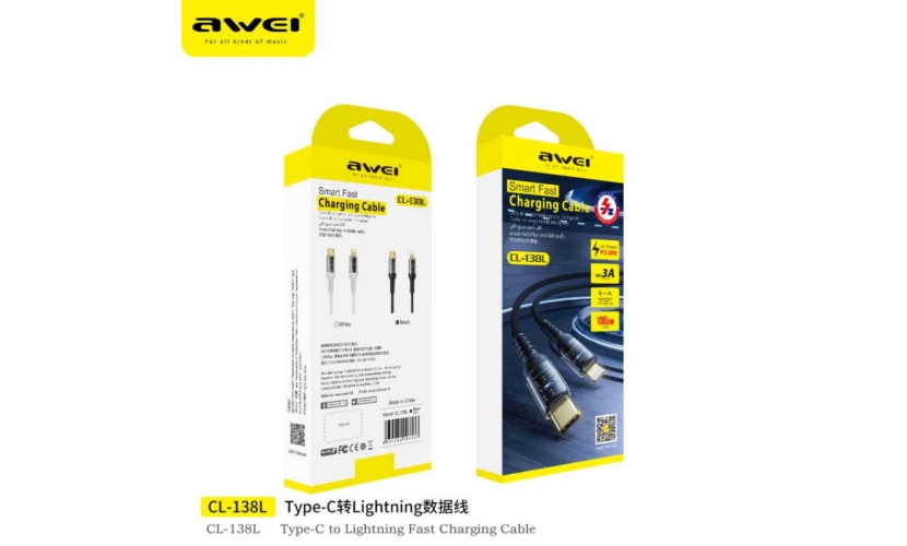 Καλώδιο γρήγορης φόρτισης και μεταφοράς δεδομένων Type-C σε Lightning - CL-138L της AWEI.Μεταφέρετε εύκολα και γρήγορα βίντεο, φωτογραφίες και μουσική ενώ παράλληλα φορτίζετε τη συσκευή σας με δυνατότητα γρήγορης φόρτισης στα PD 20W.