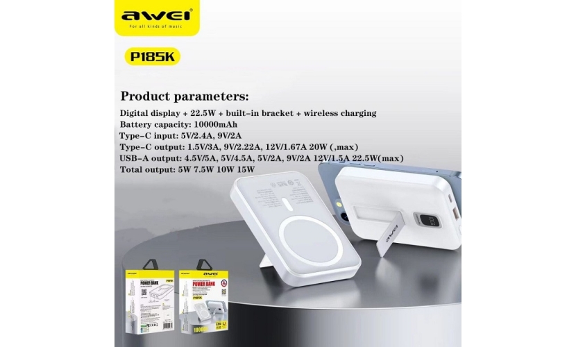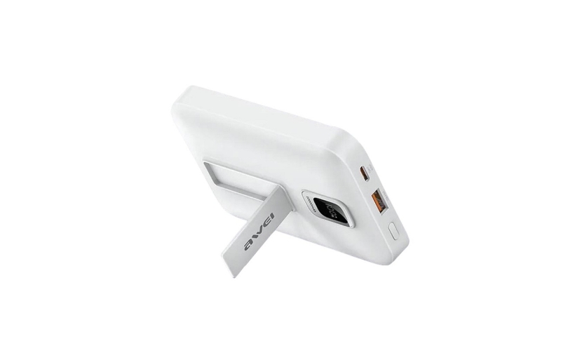 Powerbank ενσύρματης και ασύρματης φόρτισης P185K από την AWEI με πρωτοποριακό σχεδιασμό, προσφέρει γρήγορη ενσύρματη φόρτιση έως 22.5W ενώ φορτίζει και ασύρματα τις συσκευές που το υποστηρίζουν χάρη στη μαγνητική βάση φόρτισης. Διαθέτει κλιπ επιτραπέζιας στήριξης για να μπορείτε να στηρίζετε το κινητό σας όσο φορτίζει μαγνητικά.