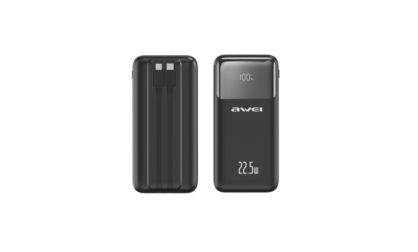Powerbank Awei μεγάλης χωρητικότητας 10.000mah, με λειτουργία γρήγορης φόρτισης στα 22.5W και σε πρακτικό μέγεθος για εύκολη μεταφορά παντού. Διαθέτει ενσωματωμένα 2 καλώδια φόρτισης Type C & Lightning για να μην χρειάζεται να μεταφέρετε ξεχωριστά το καλώδιό σας.
