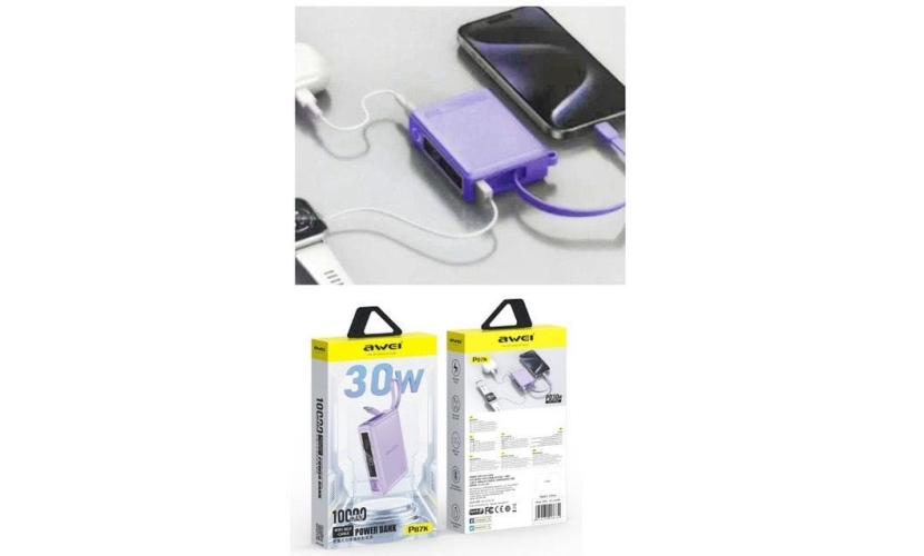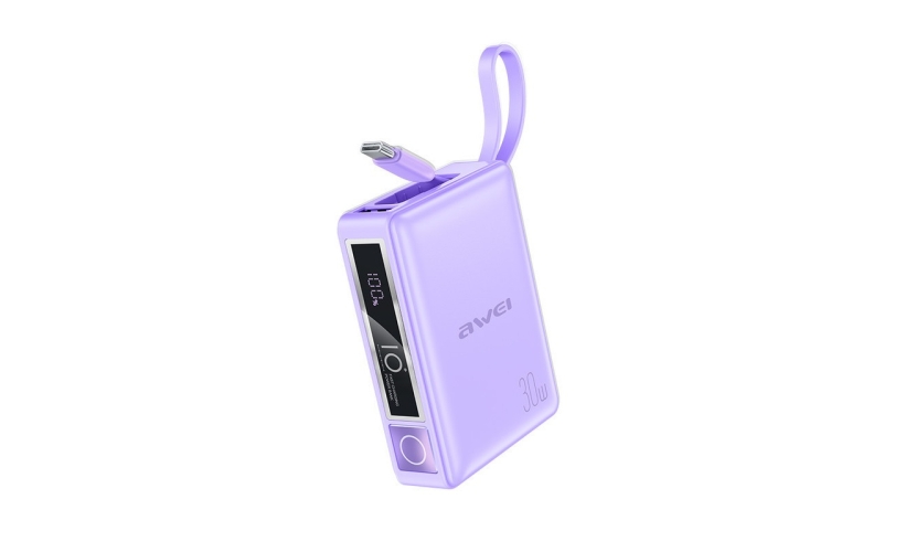 Powerbank Awei μεγάλης χωρητικότητας 10.000mah, που προσφέρει εξαιρετικά γρήγορη φόρτιση στα 30W και σε πρακτικό μέγεθος για εύκολη μεταφορά παντού. Διαθέτει ενσωματωμένο καλώδιο φόρτισης Type C για να μην χρειάζεται να μεταφέρεται ξεχωριστά το καλώδιό σας.