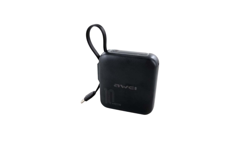 Powerbank Awei μεγάλης χωρητικότητας 10.000mah, με λειτουργία γρήγορης φόρτισης στα 22.5W και σε πρακτικό μέγεθος για εύκολη μεταφορά παντού. Διαθέτει 1 θύρα Type C και ενσωματωμένο καλώδιο φόρτισης Type C για να μην χρειάζεται να μεταφέρεται ξεχωριστά το καλώδιό σας.