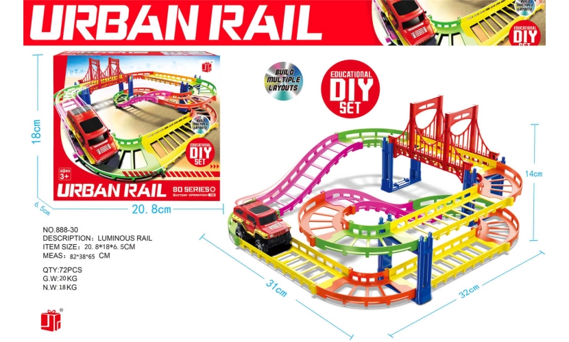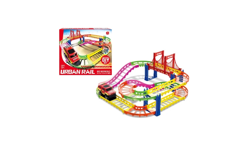 Υπέροχη πίστα-αυτοκινητόδρομος που στήνεται πανεύκολα. Διαθέτει πολύχρωμες ράγες με γέφυρα και όχημα-τζιπ.
