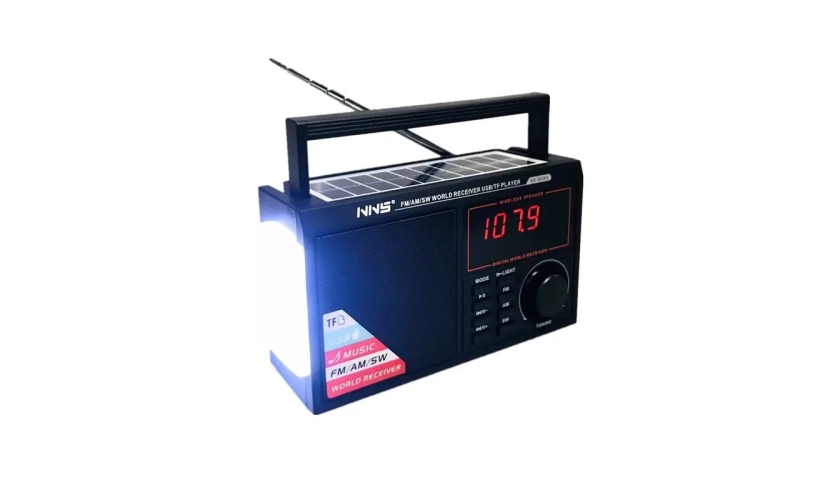 Χαρακτηριστικά: Bluetooth, Αναλογικό tuning, Συχνότητες ραδιοφώνου: FM: 87.5 – 108 (64-108) MHz, Ισχύς: 2W, Φόρτιση: ενσωματωμένη μπαταρία 18650 Lithium battery 1200mah, Θύρες: TF Card, USB, Micro USB, Ηλιακό πάνελ φόρτισης, Πλαϊνός φακός LED, Πτυσσόμενη κεραία, Χειρολαβή μεταφοράς. Διαστάσεις: 18.5 x 10.5 x 8cm.