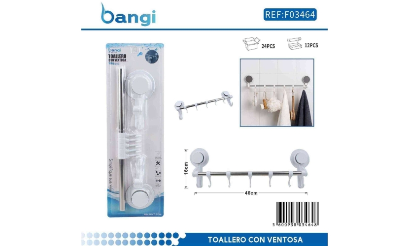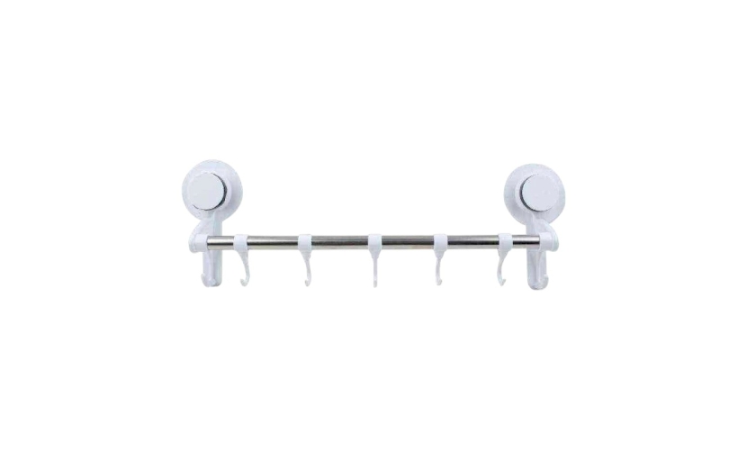 Κρεμάστρα πετσέτας μπάνιου με άγκιστρα κρεμάσματος ρυθμιζόμενης θέσης, με μεταλλική ράγα inox και πλαστικές βάσεις υψηλής ανθεκτικότητας. Εύκολη τοποθέτηση με ισχυρές βεντούζες, χωρίς να απαιτείται βίδωμα.