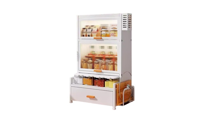 Πλαστικό ντουλαπάκι και ραφιέρα οργάνωσης πάγκου κουζίνας, με στιβαρό μεταλλικό σκελετό,με συρτάρι, ράφι και 2 κλειστά ντουλαπάκια με μαγνητικό πορτάκι.Κατάλληλη για τρόφιμα και δοχεία, με πρακτικές βάσεις/κρεμάστρες μαχαιροπίρουνων και αξεσουάρ στα πλαϊνά. Διαθέτει αντιολισθητικά πατάκια με ρυθμιζόμενο ύψος για σταθερότητα και προστασία της επιφάνειας τοποθέτησης.