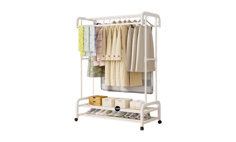 Τροχήλατη κρεμάστρα δαπέδου μεταλλική, με 2 ράφια παπουτσιών, ιδανική ως έπιπλο εισόδου ή για την οργάνωση των ρούχων στο δωμάτιό σας. Διαστάσεις: 163 x 91 x 46 cm.