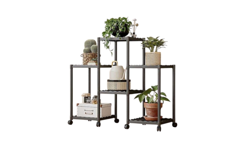 Διακοσμητική ραφιέρα δαπέδου με 6 τετράγωνα ράφια, συναρμολογούμενη, με μεταλλικό σκελετό και πλαστικά ανθεκτικά ράφια, ιδανική για την οργάνωση φυτών και την διακόσμηση χώρου.Με ροδάκια για εύκολη μετακίνηση.
