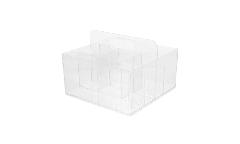 Πλαστικό κουτί οργάνωσης καλλυντικών και μπιζού, με πολλαπλές θήκες οργάνωσης, χειρολαβή και εργονομική σχεδίαση.