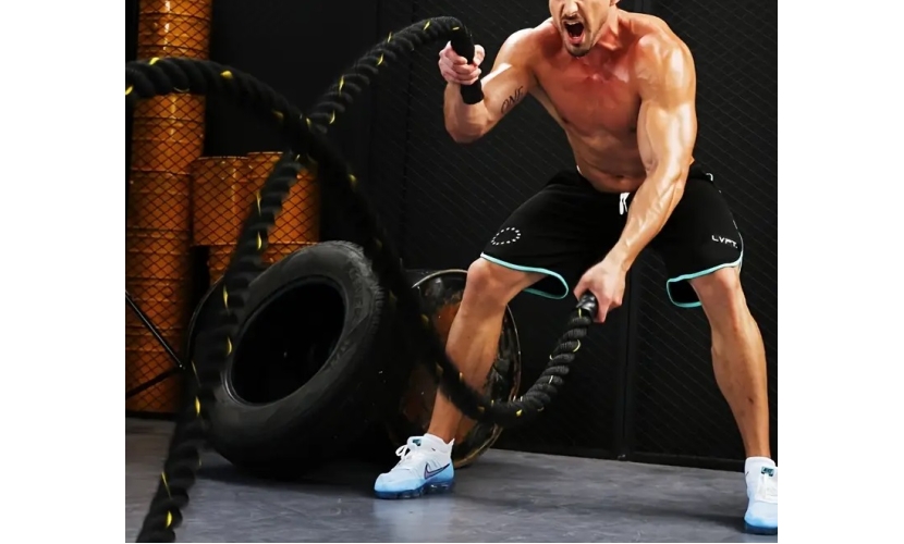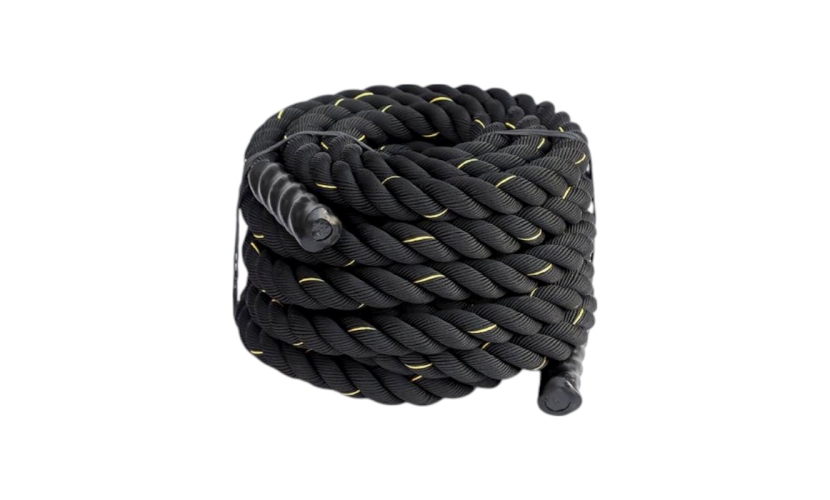 Σχοινί Crossfit βαρέως τύπου, ιδανικό για εντατική ενδυνάμωση των μυών και εκγύμναση όλου του σώματος, με εργονομικές αντιολισθητικές λαβές, κατασκευασμένο 100% από πολυεστέρα υψηλής ποιότητας και αντοχής. Μήκος: 9mΠάχος: 25mm