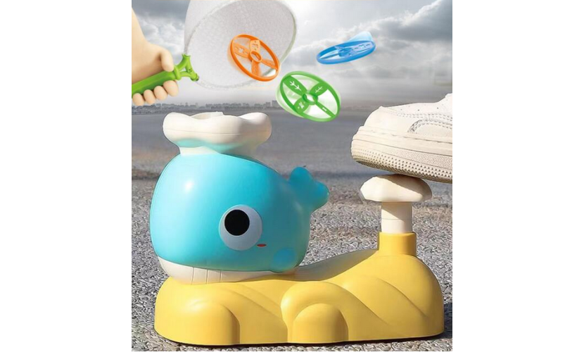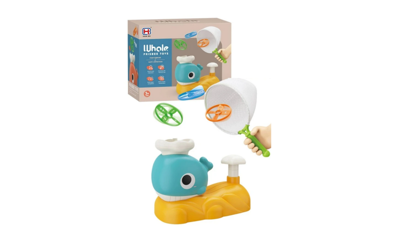 Παιδικό παιχνίδι με φάλαινα που εκτοξεύει Frisbee με το πάτημα ενός κουμπιού για να τα πιάσεις με την απόχη σου.Ένα υπέροχο παιχνίδι που θα εξασκήσει τα αντανακλαστικά σας και θα σας προσφέρει ατελείωτες ώρες διασκέδασης!
