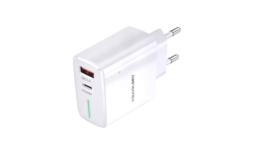 Αντάπτορας φόρτισης πρίζας Fast Charge με 2 θύρες USB-A & Type-C. Υποστηρίζει γρήγορη φόρτιση ισχύος έως και 20W.Φωτεινή λυχνία χρώματος πράσινου. Χρώμα: Λευκό. Input: 100-240V 50-60Hz. Output 1: 5V/3A 9V/2.22A 12V/1.67A. Output 2: 5V/3A 9V/2A 12V/1.5A. Max Power: 20W.