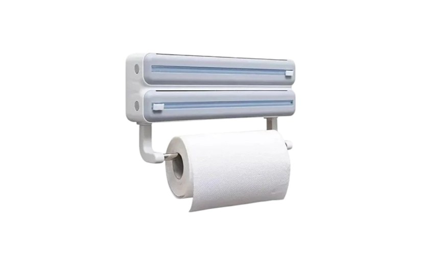 Επιτοίχια βάση ρολού κουζίνας με 2 ενσωματωμένες θήκες για μεμβράνη & αλουμινόχαρτο, με κόφτη για άμεση και εύκολη χρήση. Ένα πρακτικό εργαλείο 3 σε 1 που θα διευκολύνει την καθημερινότητα στην κουζίνα σας, εξοικονομώντας χώρο και χρόνο!