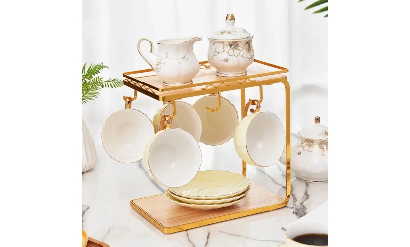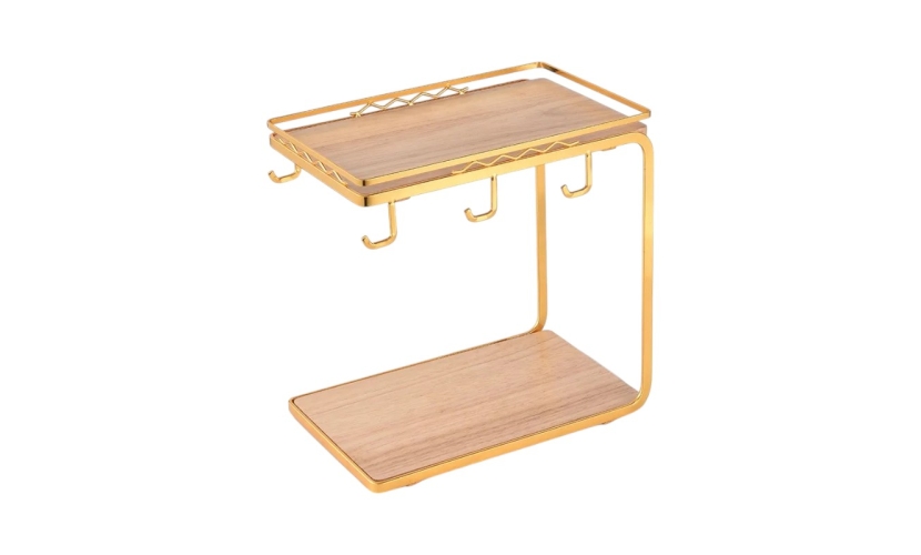 Ραφιέρα οργάνωσης σετ τσαγιού με 2 επίπεδα, με πρακτικά γαντζάκια για το κρέμασμα των φλυτζανιών και 2 βάσεις τοποθέτησης πιάτων και σκευών. Εντυπωσιακός σχεδιασμός με μεταλλικό σκελετό και επιφάνεια με εφέ ξύλου, που θα προσδώσει μία όμορφη vintage νότα στην κουζίνα σας.
