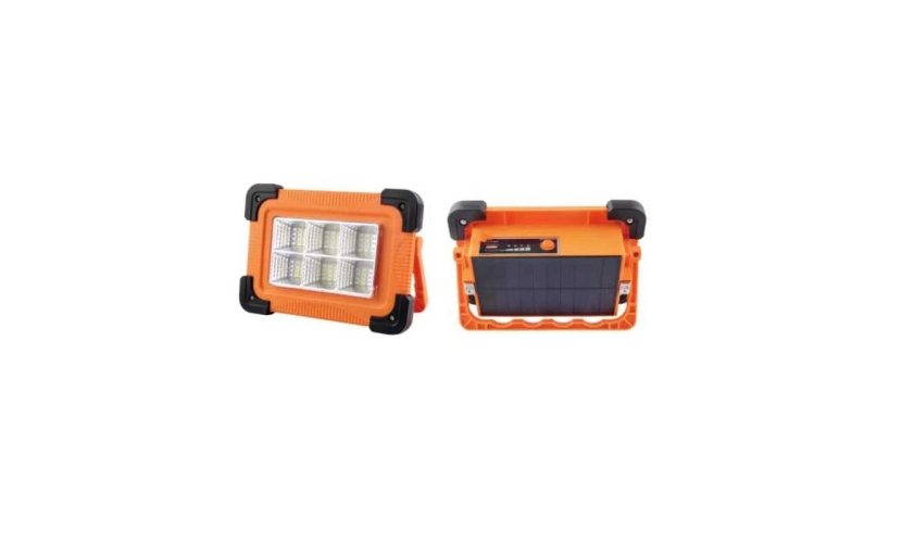 Επαναφορτιζόμενος φακός εργασίας με ενσωματωμένο ηλιακό πάνελ για έξτρα αυτονομία μπαταρίας, ισχυρό φωτισμό με ρυθμίσεις και εργονομική βάση στήριξης, ιδανικός για χρήση σε εξωτερικές δραστηριότητες, χόμπυ και εργασία.
