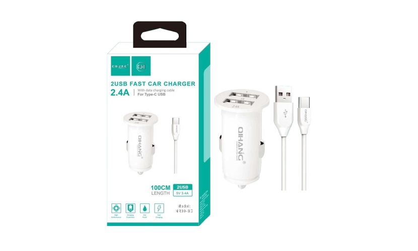 Φορτιστής αυτοκινήτου με καλώδιο USB Type C, για Αndroid συσκευές.2 θύρες USB Έντασης Ρεύματος Φορτιστή: 2.4A + 1ΑMήκος καλωδίου: 1m