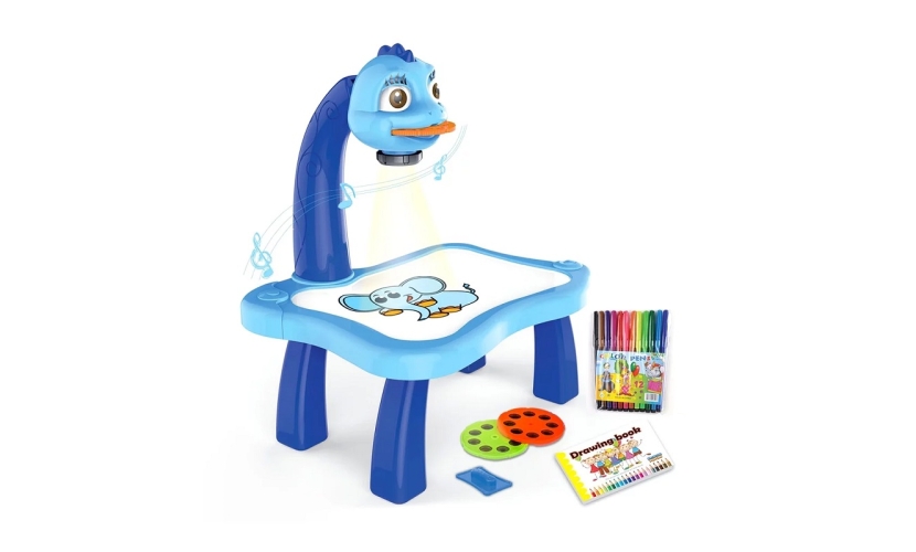 Προτζέκτορας ζωγραφικής σε υπέροχο σχεδιασμό Δεινόσαυρος που θα σε βοηθήσει να δημιουργήσεις πανεύκολα ζωγραφιές που θα εντυπωσιάσουν! Περιλαμβάνει 3 κάρτες με 8 slides η καθεμία και μαρκαδόρους όλων των χρωμάτων. Ανθεκτική κατασκευή που στήνεται πανεύκολα.