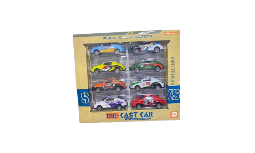 Μεταλλικά αυτοκινητάκια, σετ 8 τεμαχίων, σε διάφορα πολύχρωμα σχέδια και ποικιλία σχεδιασμού, με Pull Back. Ολοκλήρωσε τη συλλογή και ετοιμάσου για συναρπαστικούς αγώνες ταχύτητας!