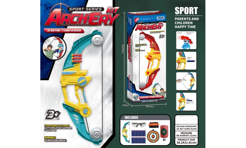 Παιδικό σετ τοξοβολίας με μεγάλο τόξο, βέλη με βεντούζα, ταμπλό στόχου και αξεσουάρ. Εντυπωσιακός σχεδιασμός, ανθεκτική κατασκευή και εργονομική λαβή για να εξασκήσεις τις ικανότητές σου και να γίνεις ο καλύτερος του αθλήματος!