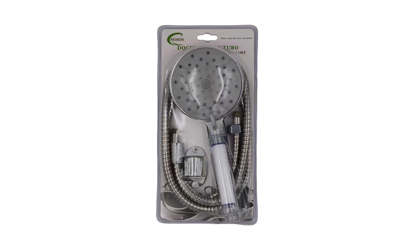 Τηλέφωνο-ακροφύσιο ντουζιέρας με 3 επιλογές πίεσης και σπιράλ σωλήνα μήκους 1.5 μέτρου, με επιτοίχια βάση και όλα τα παρελκόμενα τοποθέτησης. Εύκολη τοποθέτηση σε όλες τις βρύσες μπανιέρας και ντουζιέρας.Το ακροφύσιο διαθέτει προστατευτικά σιλικόνης στις εξόδους νερού, που αποτρέπουν την συσσώρευση αλάτων. Υψηλή ποιότητα κατασκευής με χρωμέ φινίρισμα, υψηλής ανθεκτικότητας.