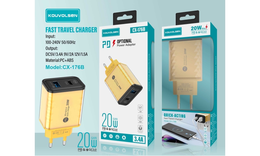 Αντάπτορας φόρτισης πρίζας Fast Charge με 2 θύρες USB-A & USB Type-C. Υποστηρίζει γρήγορη φόρτιση ισχύος έως και 20W. Χρώμα: Κίτρινο. Input: 100-240V 50-60Hz. Output 1: 5V/3A 9V/2A 12V/1.5A. Output 2: 5V/3A 9V/2A 12V/1.5A. Max Power: 20W.