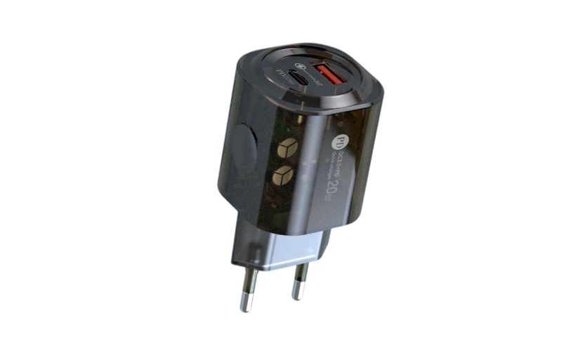 Αντάπτορας φόρτισης πρίζας Fast Charge με 2 θύρες USB-A & USB Type-C. Υποστηρίζει γρήγορη φόρτιση ισχύος έως και 20W. Χρώμα: Μαύρο διαφανές. Input: 100-240V 50-60Hz. Output 1: 5V/3.5A 9V/2A 12V/1.5A. Output 2: 5V/3.5A 9V/2A 12V/1.5A.Max Power: 20W.