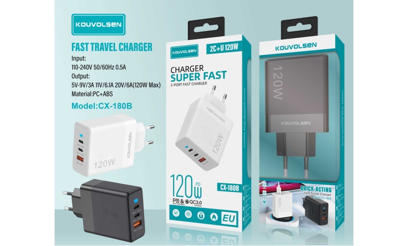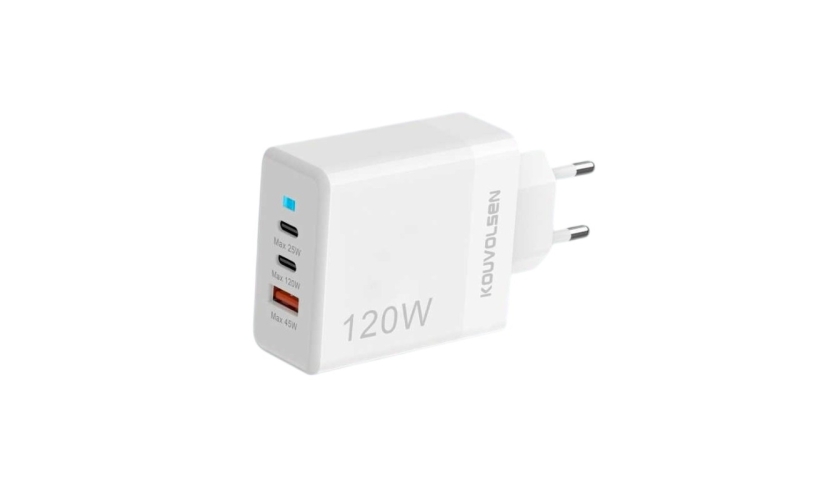 Αντάπτορας φόρτισης πρίζας Fast Charge με 3 θύρες 1*USB-A & 2*USB Type-C. Υποστηρίζει εξαιρετικά γρήγορη φόρτιση συνολικής ισχύος έως και 120W.Input: 100-240V 50-60Hz. Output: 5V-9V/3A, 11V/6.1A, 20V/6A.Max Power: 120W.Φωτεινή Λυχνία LED.