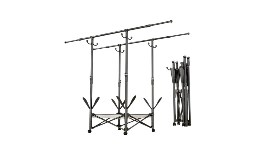 Πτυσσόμενη κρεμάστρα δαπέδου και απλώστρα ρούχων πολλαπλών χρήσεων, με μεταλλικό σκελετό, με γαντζάκια μικρών ρούχων, βάσεις παπουτσιών και ροδάκια μετακίνησης.Με εργονομικό σχεδιασμό που αναδιπλώνεται για εξαιρετικά εύκολη αποθήκευση και μεταφορά χωρίς να καταλαμβάνει χώρο.Με δυνατότητα επέκτασης του οριζόντιου δοκαριού για εύκολη προσαρμογή στις ανάγκες σας.