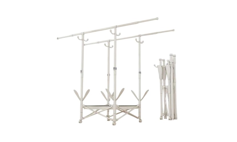 Πτυσσόμενη κρεμάστρα δαπέδου και απλώστρα ρούχων πολλαπλών χρήσεων, με μεταλλικό σκελετό, με γαντζάκια μικρών ρούχων, βάσεις παπουτσιών και ροδάκια μετακίνησης.Με εργονομικό σχεδιασμό που αναδιπλώνεται για εξαιρετικά εύκολη αποθήκευση και μεταφορά χωρίς να καταλαμβάνει χώρο.Με δυνατότητα επέκτασης του οριζόντιου δοκαριού για εύκολη προσαρμογή στις ανάγκες σας.
