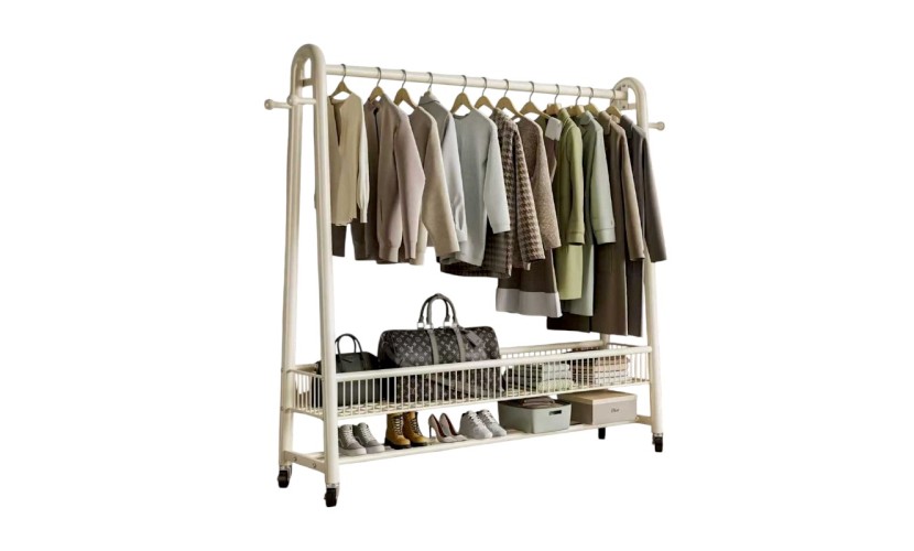 Τροχήλατη κρεμάστρα δαπέδου μεταλλική, με 2 ράφια παπουτσιών και αξεσουάρ, ιδανική ως έπιπλο εισόδου ή για την οργάνωση των ρούχων στο δωμάτιό σας.Διαστάσεις: 170 x 120 x 40 cm.